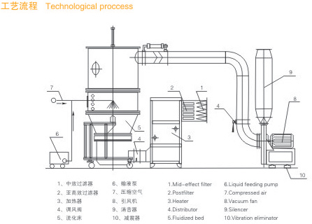 物料粉末粒子,在原料容器(流化床)中呈環(huán)形流化狀態(tài),受到經(jīng)過凈化后的加熱空氣預(yù)熱和混合,將粘合劑溶液霧化噴入,使若干粒子聚集成含有粘合劑的團粒,由于熱空氣對物料的不斷干燥,使團粒中水分蒸發(fā),粘合劑凝固,此過程不斷重復(fù)進行,形成理想的、均勻的多微孔球狀顆粒。